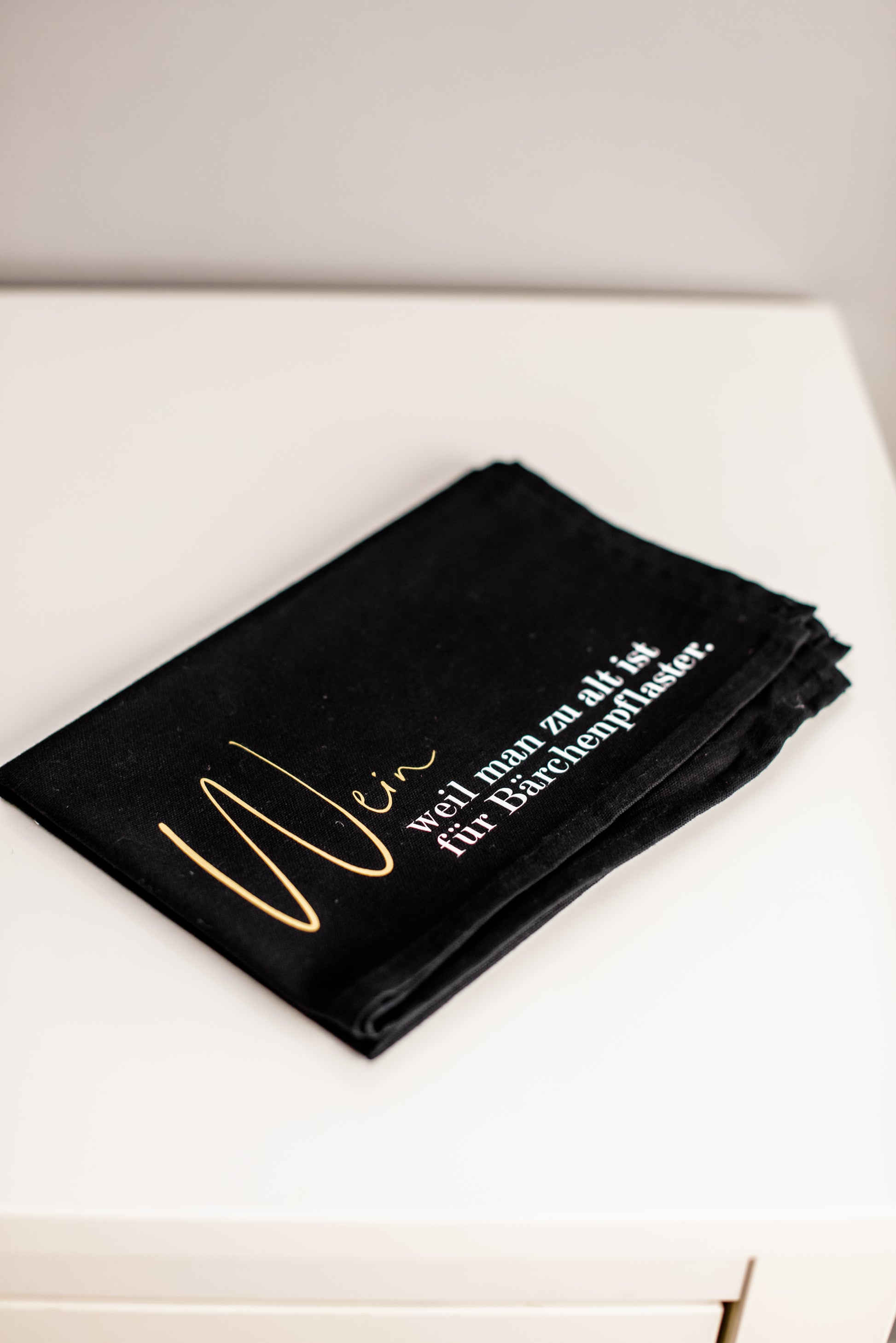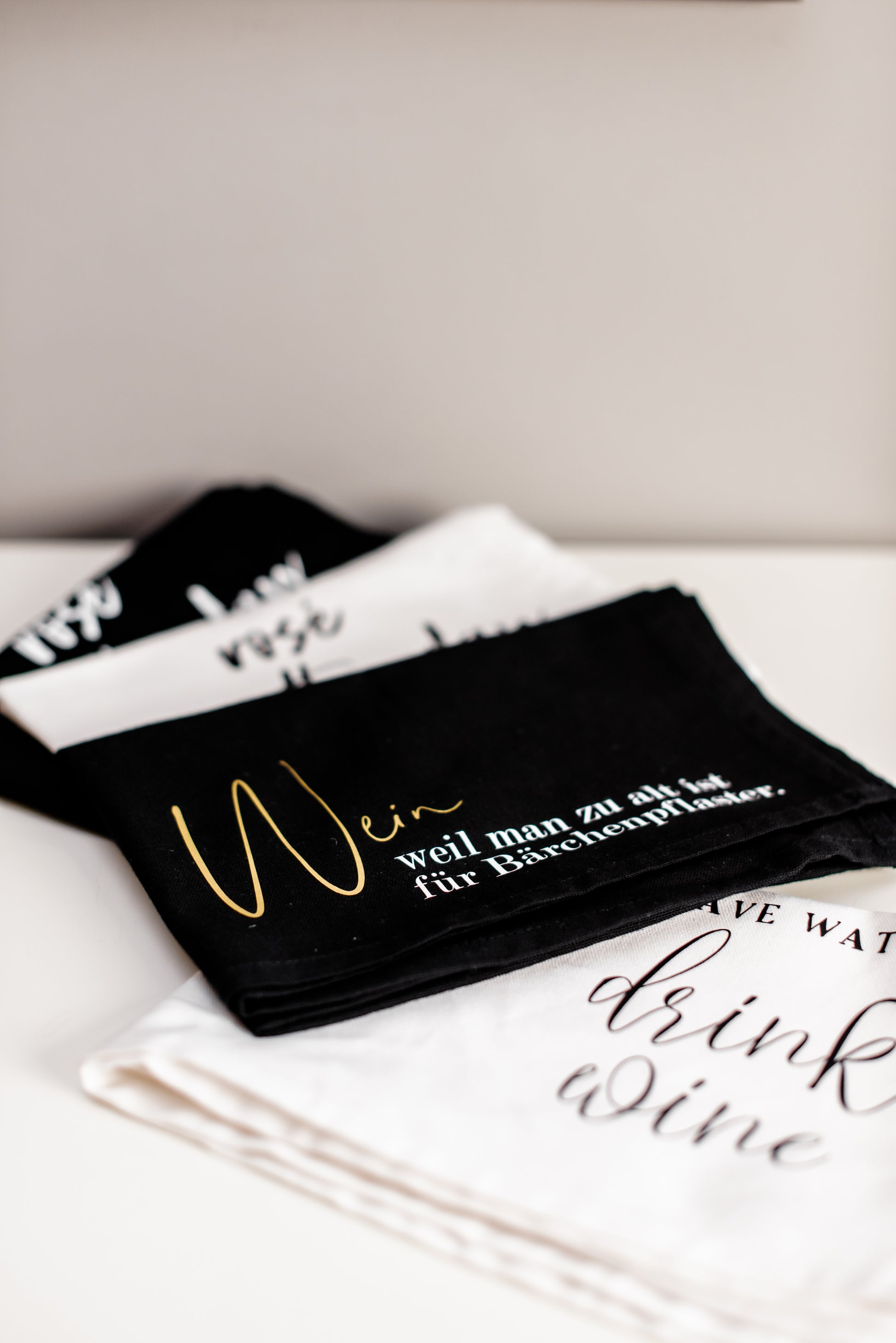 Schönes Geschirrtuch mit selbst designtem Aufdruck 'Wein, weil man zu alt ist für Bärchenpflaster'. Damit wird auch der Abwasch mit Leichtigkeit bezwungen.