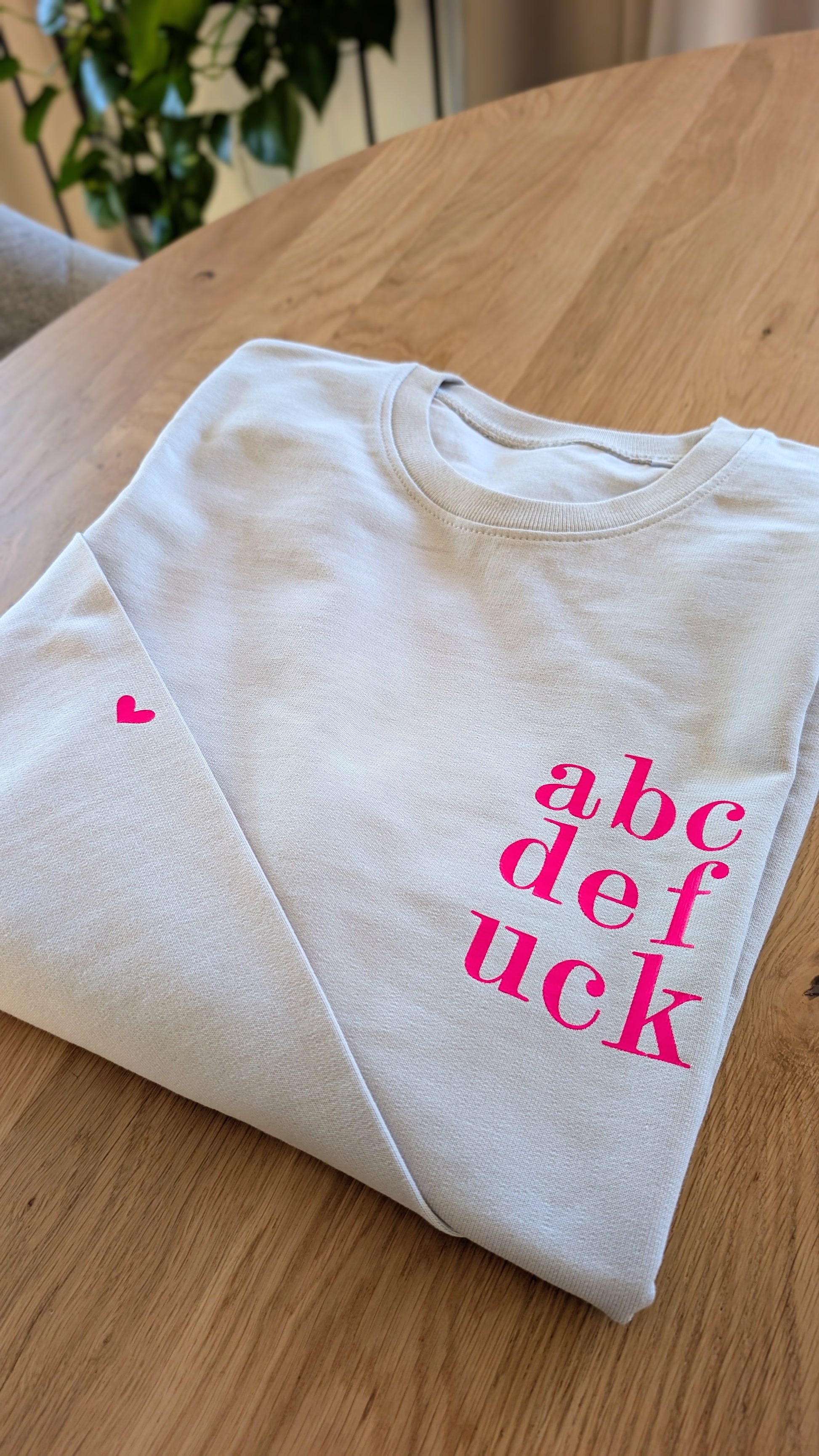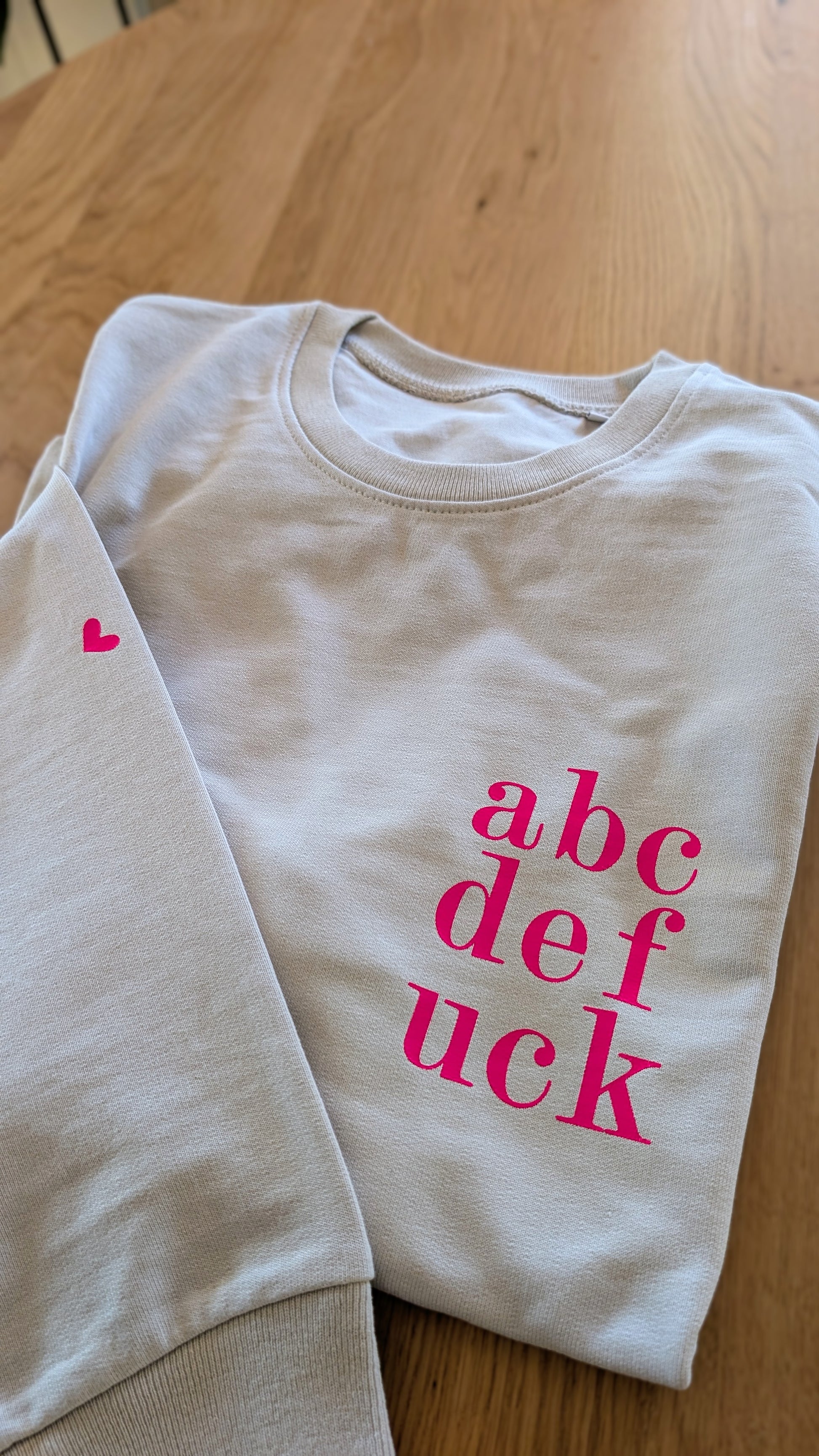 Gerade geschnittener Damen Sweater mit neon pinkem "abcd" auf der Brust.