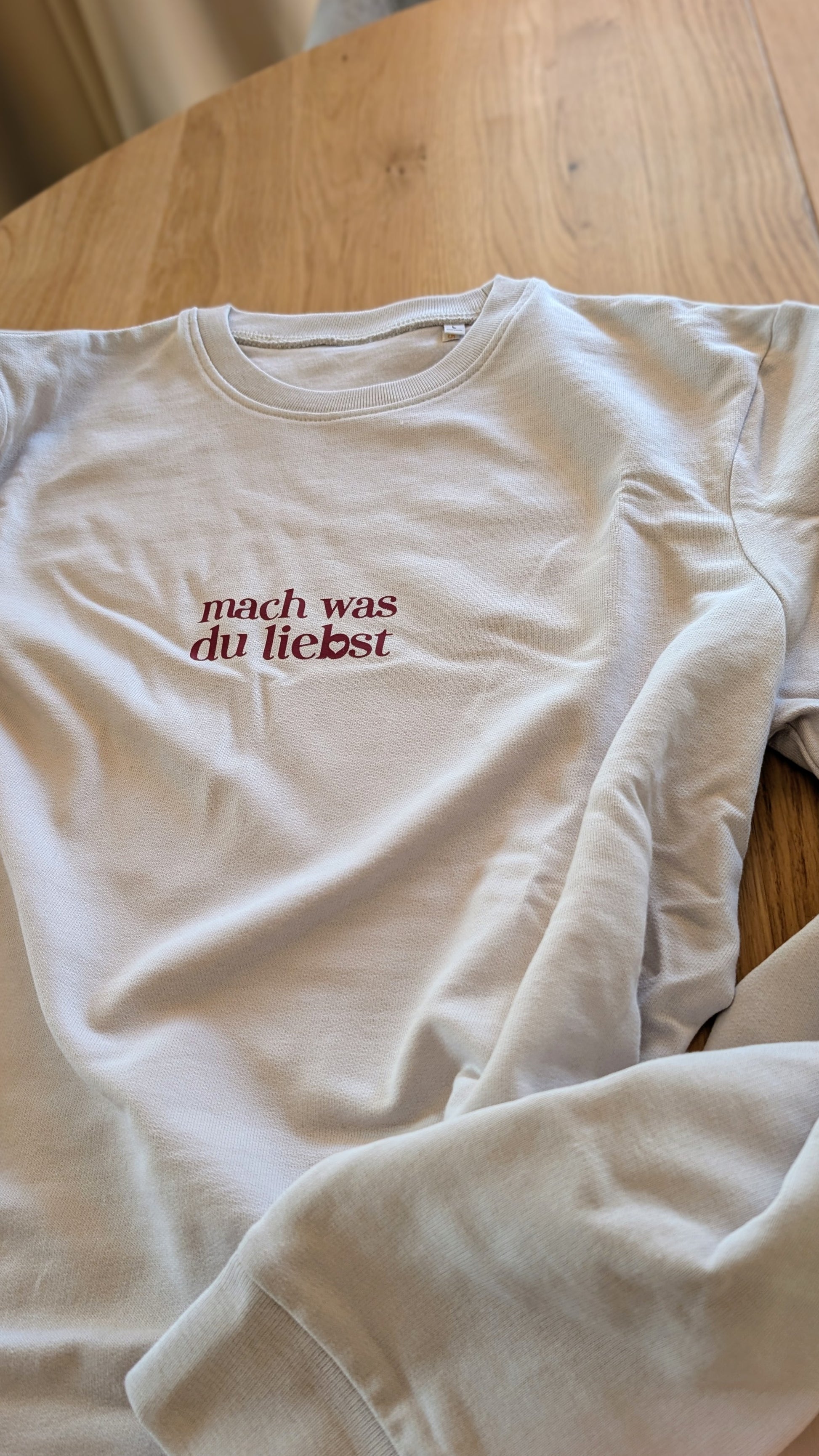 Gerade geschnittener Damen Sweater mit bordeaux farbenem Aufdruck "mach was du liebst" auf der Brust.